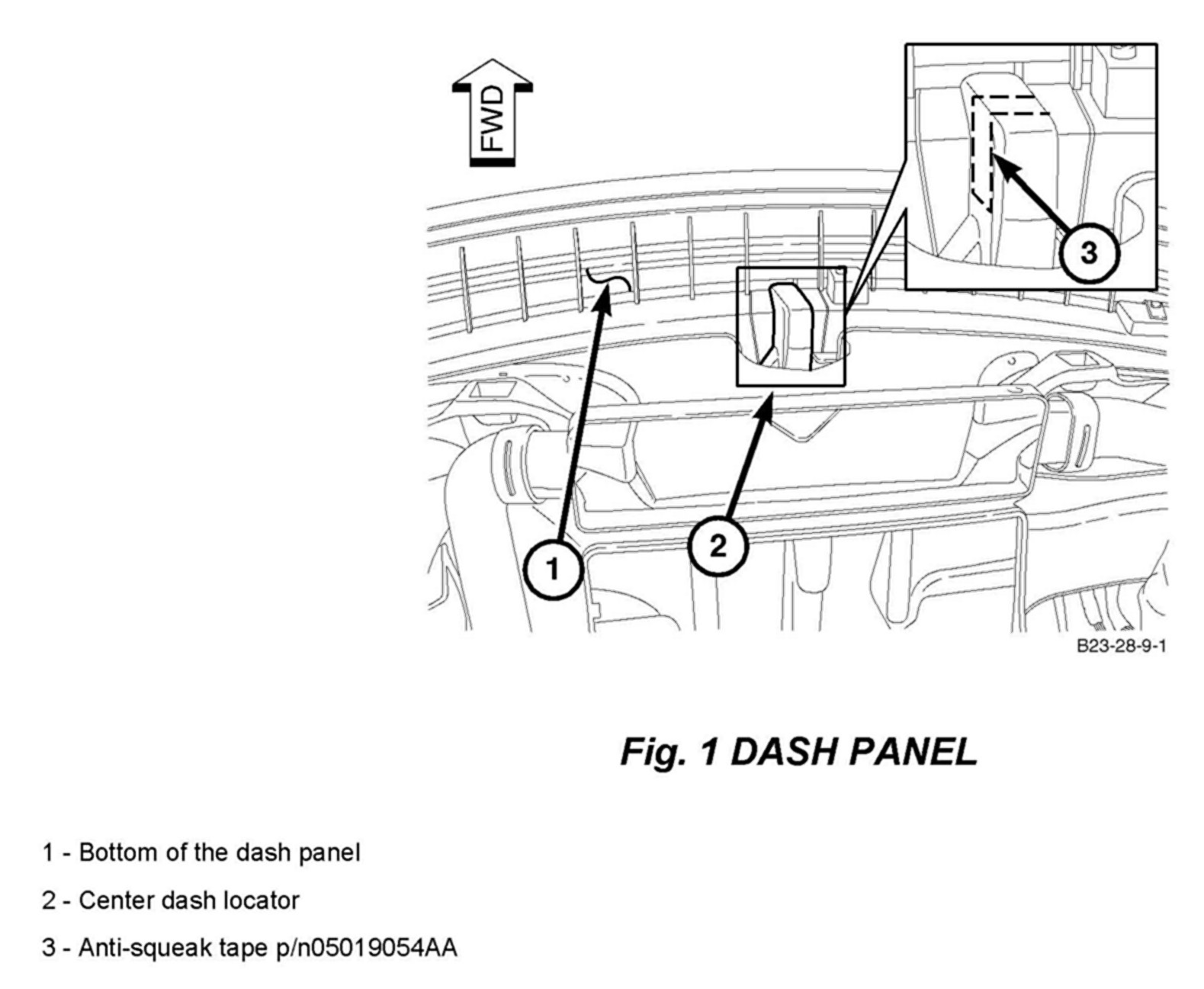 This bulletin involves removing the dash panel assembly and applying anti-squeak tape to the locator pin and lubricating the center locator bracket.