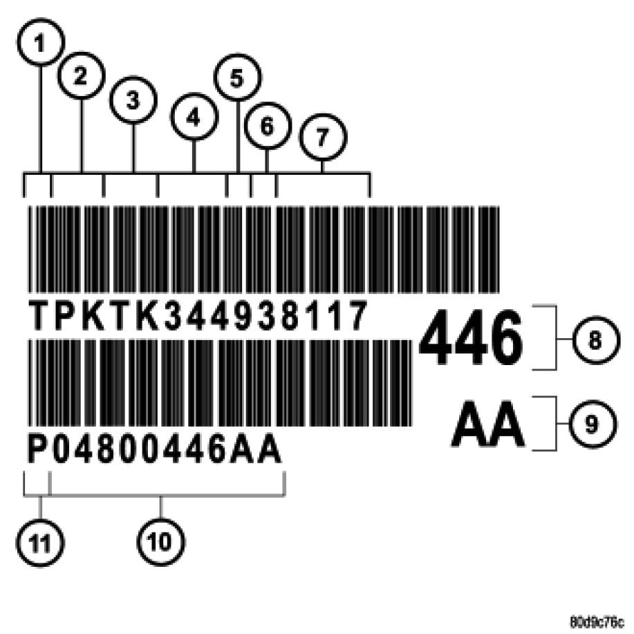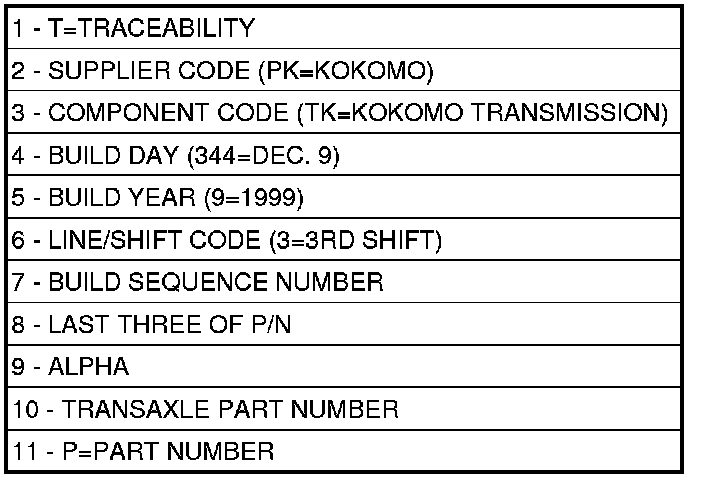 The label contains a series of digits that can be translated into useful information such as transaxle part number, date of manufacture, manufacturing origin, plant shift number, build sequence number, etc. Refer to chart for identification label breakdown.