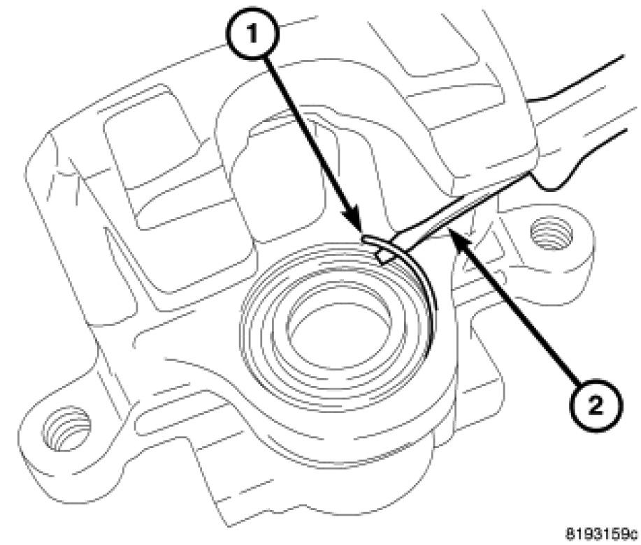 2. Using a small screwdriver (2) or like tool, carefully remove the boot snap-ring (1) making sure not to damage the dust boot, piston or piston bore.