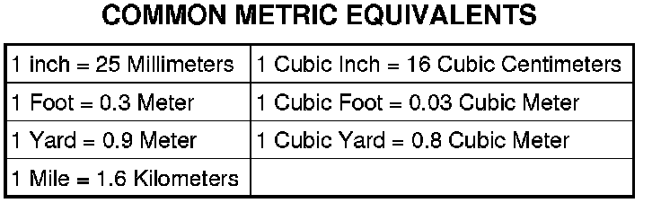 The following chart will assist in converting metric units to equivalent English and SAE units, or vise versa.