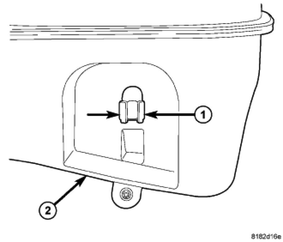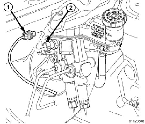 1. Align the brake fluid level switch with its mounting hole on the right side of the master cylinder brake fluid reservoir. Push the switch into the fluid reservoir until the switch retaining tabs (1) are expanded on the opposite side of the reservoir (2), locking it in place.