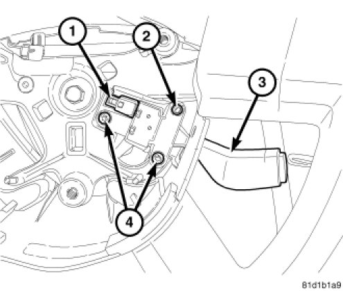 1. Install speed control switch (3) onto the locating pin (2) in the steering wheel. Make sure rubber seal is in place around switch.