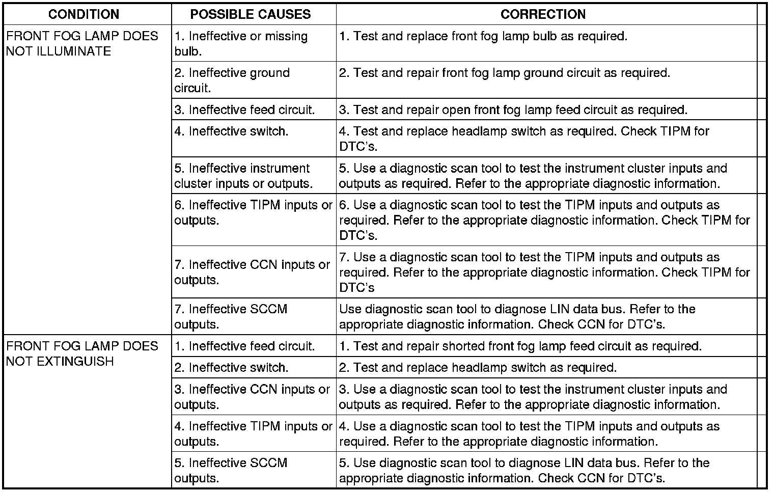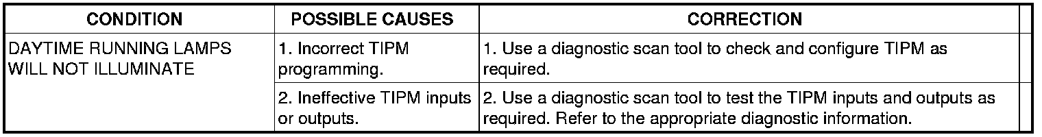 NOTE: Before performing the following tests, determine whether the headlamp low and high beams operate. If the headlamp low and high beams are also inoperative, diagnose and repair that problem before attempting to repair the Daytime Running Lamps.