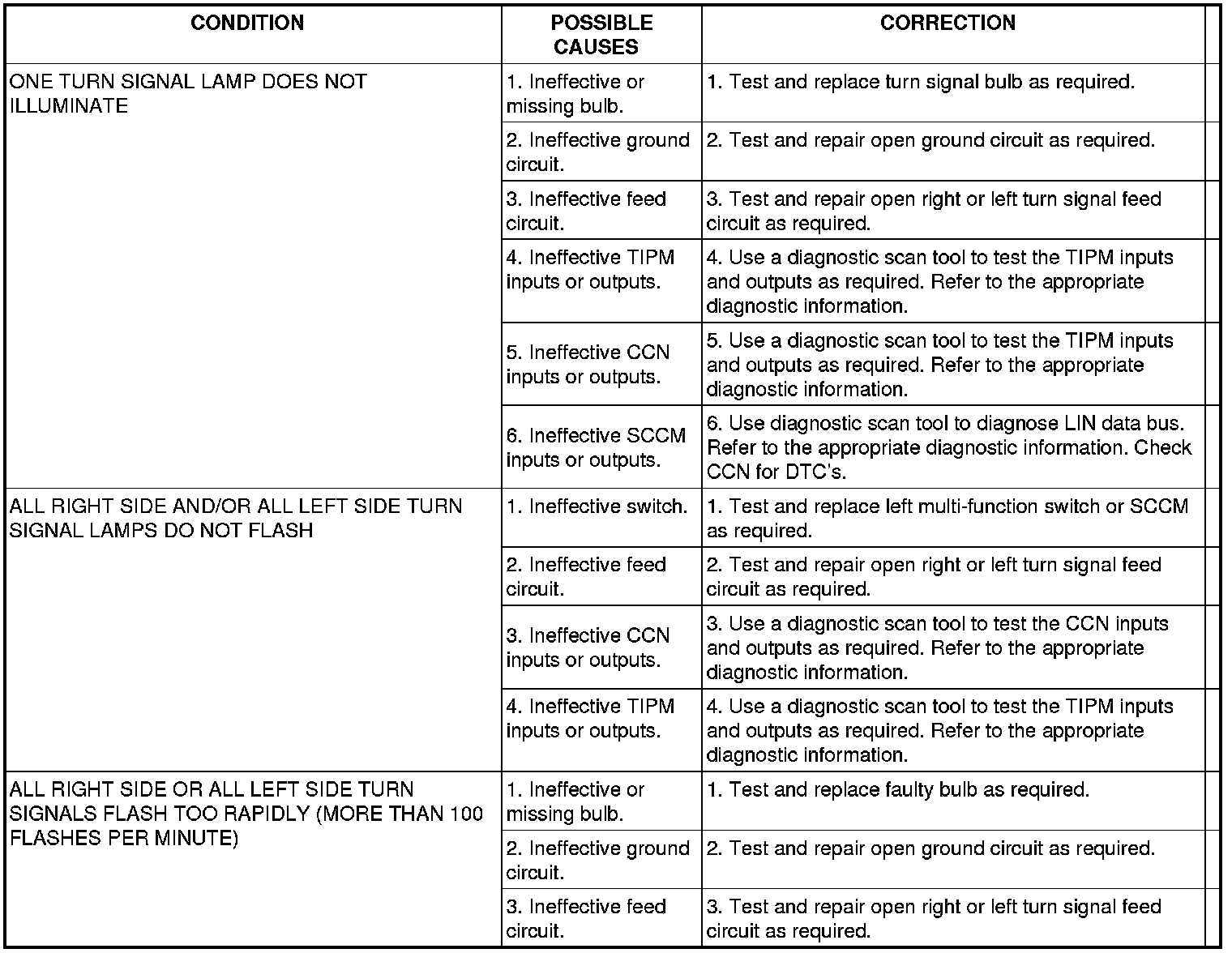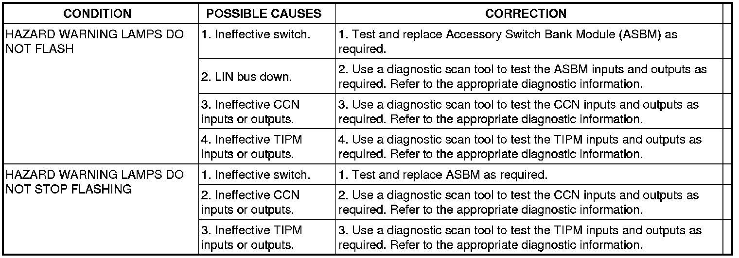 NOTE: Before performing the following tests, confirm whether the left and right turn signals operate satisfactorily. If the turn signals are inoperative or operate improperly, diagnose and repair that problem before attempting to repair the Hazard Warning Lamps.