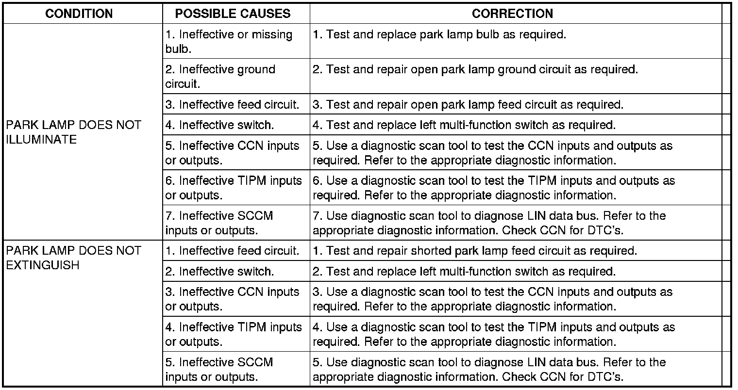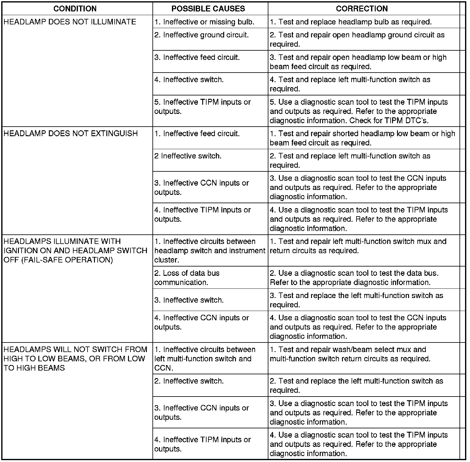 NOTE: As part of the exterior lighting fail-safe feature, upon ignition On all exterior park lamps and the headlamp low beams will illuminate regardless of the headlamp switch position if the CCN cannot detect an input from the headlamp switch, or if there is a loss of data bus communication.