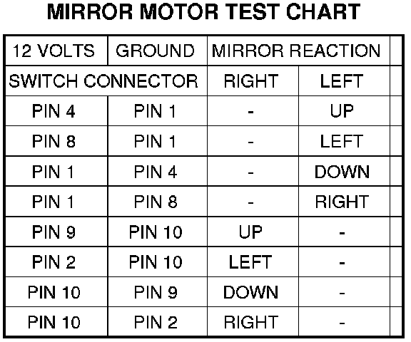 - Refer to the Mirror Motor Test Chart for proper wire connections at the switch connector.