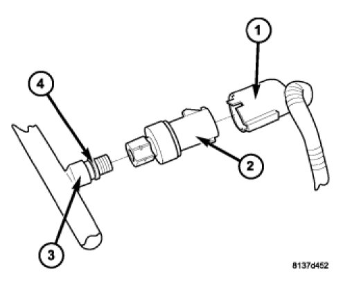 2. Install the A/C pressure transducer (2) onto the A/C discharge line. Tighten the A/C pressure transducer securely.