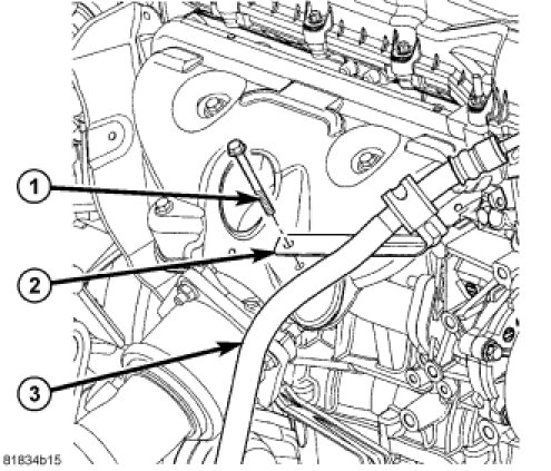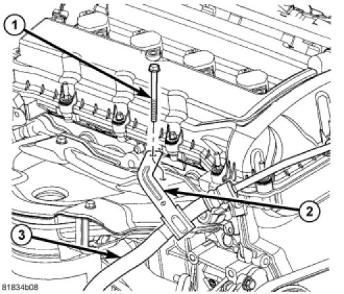 11. 2.4L Engine with All-Wheel-Drive - Position the pressure hose routing clamp (2) at the exhaust manifold and install the mounting bolt (1). Tighten the bolt to 9 Nm (80 in. lbs.).