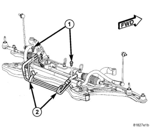 3. Install the fasteners (1) securing the power steering hose routing clamps (2) to the crossmember. Use a NEW push clip on the left and tighten the screw on the right to 8 Nm (71 in. lbs.).
