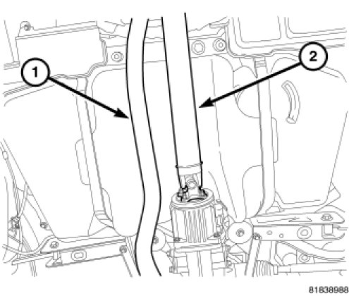 NOTE: For All Wheel Drive vehicles the rear driveline module must be lowered to remove fuel tank assembly.