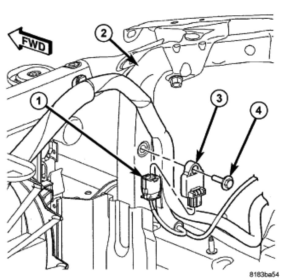 3. Position the sensor onto the back of the right or left radiator support vertical member (2).
