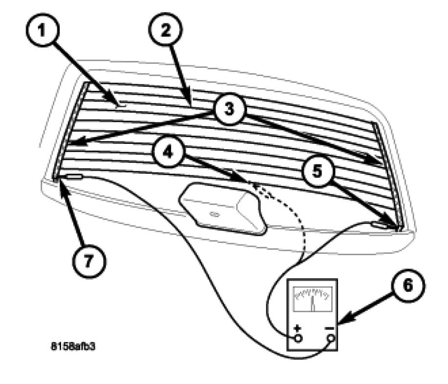 3. If a temperature difference is not detected, use a 12-volt DC voltmeter (6) and contact the rear glass heating grid terminal A (5) with the positive lead, and terminal B (7) with the negative lead. The voltmeter should read battery voltage. If the voltmeter does not read battery voltage, check the following: