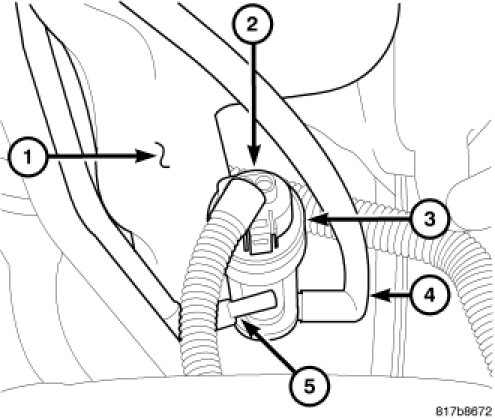 4. Reconnect the two washer hoses (4 and 5) to the two barbed pump outlet nipples. Be certain that the hose in the trough on the outboard side of the reservoir is connected to the rear (black) nipple, and the hose on the inboard side of the reservoir is connected to the front (white) nipple.