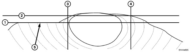 With the horizontal centerline of the headlamp (2) transferred on the wall, measure down 53 mm (2.1 in). This line (1) will be the vertical aiming mark. Using the left side of the headlamp vertical centerline (3), adjust the headlamp unit so the residual light from the headlamp, not the hot spot, is even with the line (1) that was marked previously 53 mm (2.1 in) below the horizontal centerline (2). The ideal alignment should be (5). The right headlamp aiming will be the same, but using the area left of right headlamp vertical centerline (not shown).