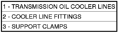 19. Disconnect transmission fluid cooler lines (1) at transmission fittings (2) and clips (3).