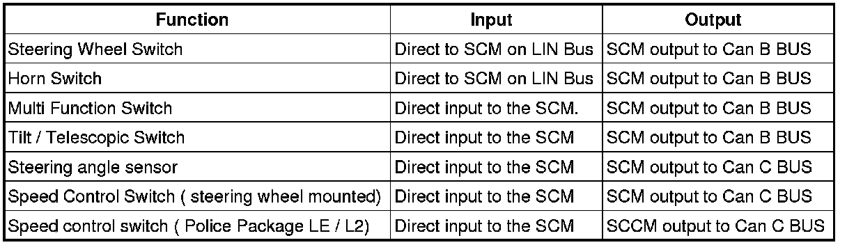 The Steering Control Module (SCM) communicates via the Local Interconnect Network (LIN) serial data bus to the steering wheel switches and the horn switch. The SCM communicates across the Can C and Can B. This is an ultra-low voltage serial data bus that allows the following components to communicate with the Controller Area Network (CAN) B and C data buses.