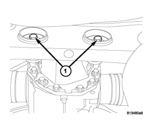 10. Using a 14mm hex, remove rear axle fill plug (1). Fill axle with 1.2L (1.3 qts.) of Mopar(R) 75W-140 Synthetic Gear & Axle Lubricant. Install fill plug and torque to 50 Nm (37 ft. lbs.).