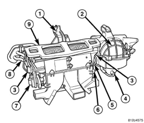 All vehicles are equipped with a common heater, ventilation and air conditioning (HVAC) housing (1). The heating-A/C system combines A/C, heating, and ventilating capabilities in a single HVAC housing mounted within the passenger compartment beneath the instrument panel. The HVAC housing includes:
