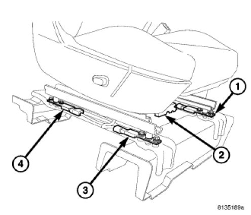 The OCM (2) provides voltage to the four seat weight sensors located on the corners of the passenger front seat (1, 3, and 4), and to the seat track position sensors on the outboard passenger and driver front seat upper seat tracks. The OCM then monitors return inputs from each of the sensors on dedicated hard wired data communication circuits. The seat weight sensor input allows the OCM to determine whether the passenger side front seat is occupied and the relative size of the occupant by providing a weight-sensing reference to the load on the seat. The seat track position sensor provides an additional logic input to the OCM microprocessor that allows it to determine the position of the front seat passenger and driver relative to the front airbags.