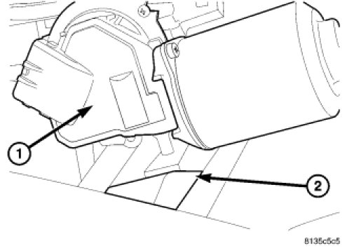 2. While positioning the wiper module in its mounting location, make sure that the dowel on the bottom of the wiper motor (1) slides into the mounting grommet (2) correctly.