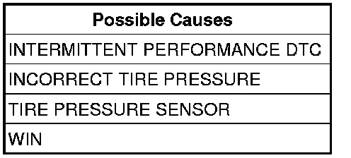 NOTE: The DTC can be caused by many different factors and might not be a sensor/transmitter or a WIN fault. Interference from other elements will over power the sensor/transmitter RF frequency making erratic operation to the TPM system. Check the vehicle for aftermarket accessories that could compromise the RF frequency signal before diagnosing the TPM system.