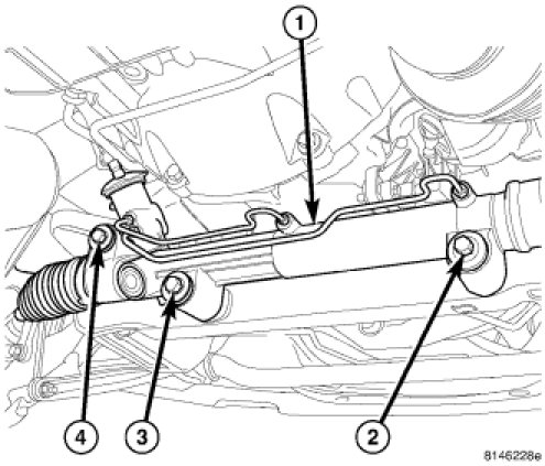 9. Install steering gear lower mounting bolts (2 and 3). Tighten to 142 Nm (105 ft. lbs.).
