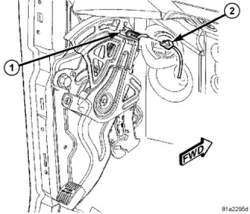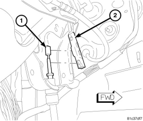 b. Once front parking brake cable strand is completely seated in cable connector (2), lift cable connector out of retaining fork using pliers and slowly allow lever mechanism to take up slack in cable.