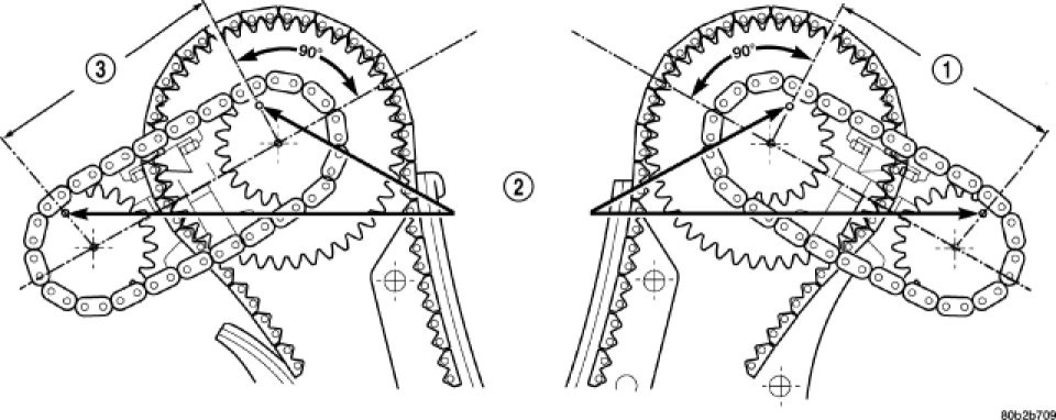 4. Count chain pins from the mark on the intake camshaft towards the exhaust camshaft (1)&(3). Engine is timed correctly when there are 12 chain pins between the timing marks (2) on the intake camshaft and exhaust camshaft.