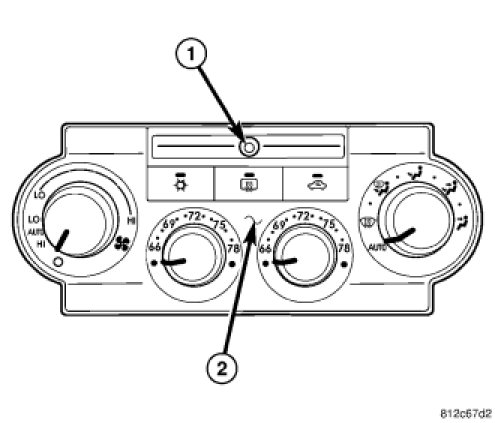 The infrared sensor is used only on models equipped with the automatic temperature control (ATC) heating -A/C system. The infrared temperature sensor consists of a infrared transducer concealed behind a clear lens (1) located within the instrument panel mounted A/C-heater control (2).