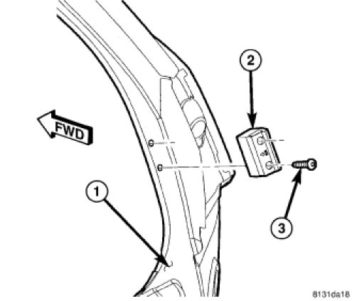 1. Position the stabilizer bumper (2) to the two mounting holes on the liftgate opening drain trough (1) with the arrow molded into the bumper pointed inboard.