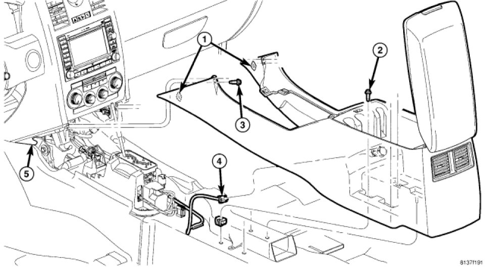 3. While holding both sides of the console at the front carefully engage the ears at the front of the console to the slots (5) at the lower instrument panel.