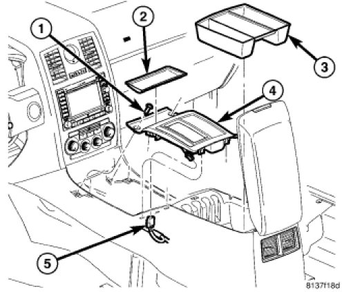 11. Position the mat (5) into the console rear bin with the curved edge oriented forward in the vehicle.