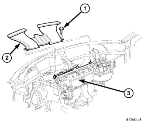 1. Position the defroster duct (2) onto the top of the HVAC air distribution housing (3).