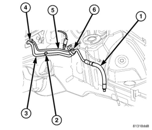 The A/C suction line is the refrigerant line that carries refrigerant from the A/C evaporator to the A/C compressor. The A/C suction line is serviced in two sections. The front section of the suction line (1) connects to the rear section of the suction line (3) with a nut (6). The rear section of the A/C suction line includes the low side service port (2) and is secured to the A/C expansion valve by a tapping plate (4). The rear section of the A/C suction line is serviced as an assembly with the rear section of the A/C liquid line (5).