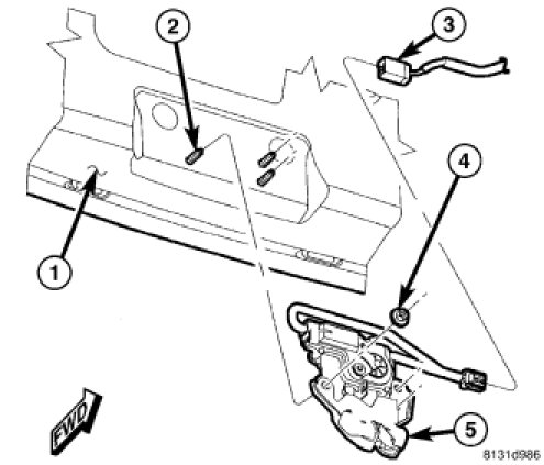 1. Position the latch (5) onto the studs (2) on the inside of the liftgate (1).