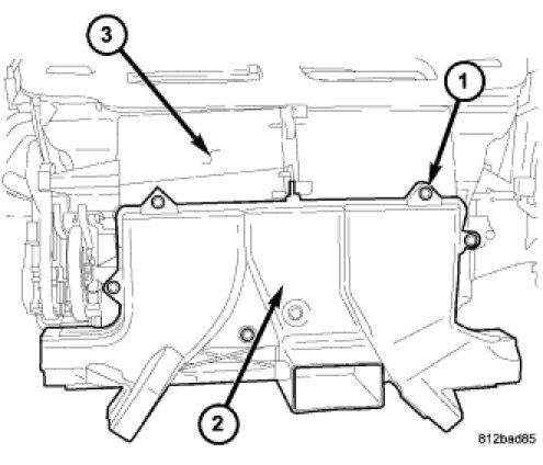 1. Position the front floor distribution duct (2) to the bottom of the HVAC air distribution housing (3).