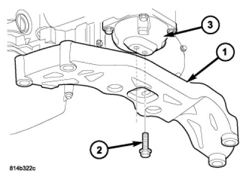 5. Remove the bolts (2) holding the transmission crossmember (1) to the transmission mount (3) and remove the crossmember from the vehicle.