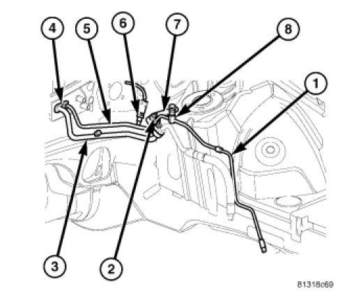 The A/C liquid line is the refrigerant line that carries refrigerant from the A/C condenser to the A/C evaporator. The A/C liquid line is serviced in two sections. The front section of the liquid line (1) connects to the rear section of the liquid line (5) with a nut (2) and includes the high side service port (8). The rear section of the A/C liquid line includes the fitting for the A/C pressure transducer (6) and a mounting bracket (7) and is secured to the A/C expansion valve by a tapping plate (4). The rear section of the A/C liquid line is serviced as an assembly with the rear section of the A/C suction line (3).