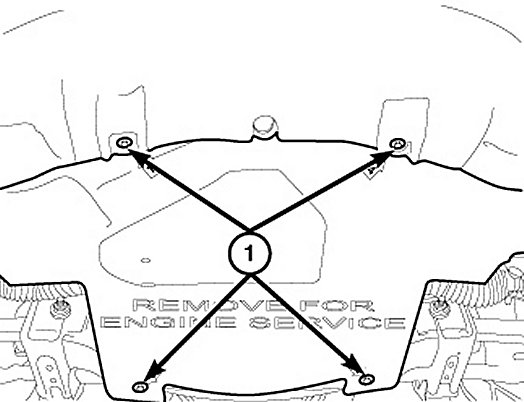 5. Remove the lower splash shield retaining bolts (1) and the splash shield.