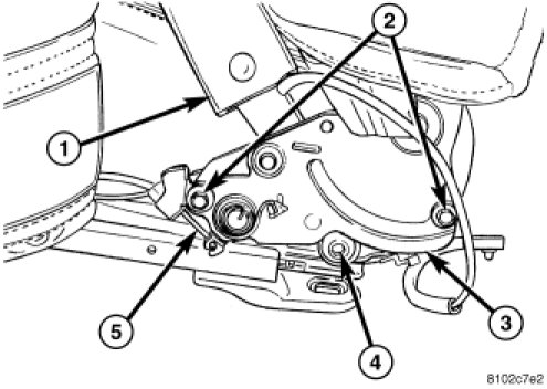 1. Install the seat adjuster (1) onto the seat cushion frame and install the bolts (2). Tighten the bolts to 28 Nm (21 ft. lbs.).