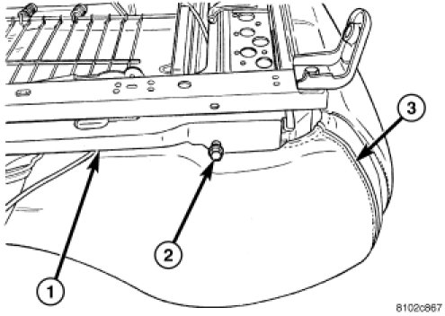 2. Install the rear seat adjuster bolts (3) and tighten the bolts to 28 Nm (21 ft. lbs.).