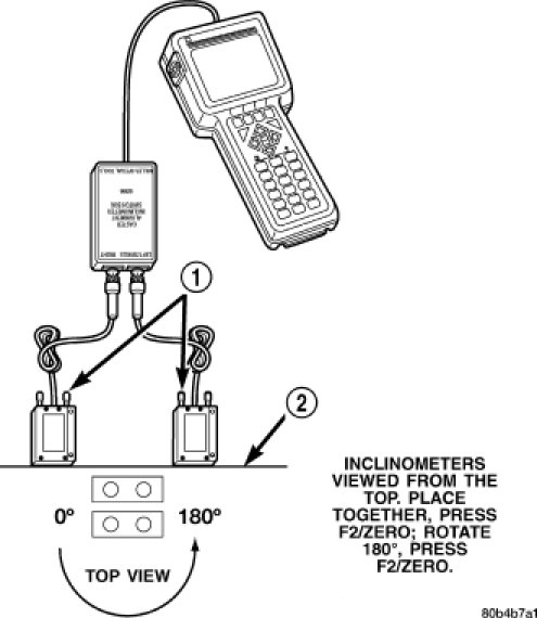 a. Place both inclinometers together on known flat, level surface (2), such as alignment rack, with knurled ends of fastening screws (1) facing upward.