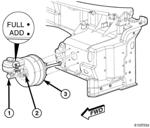 The brake fluid reservoir is marked FULL and ADD indicating the allowable brake fluid level range in the reservoir.