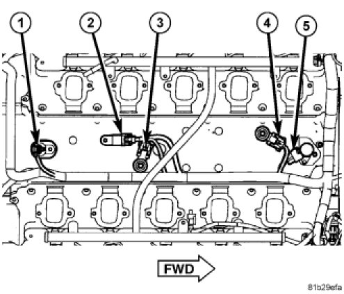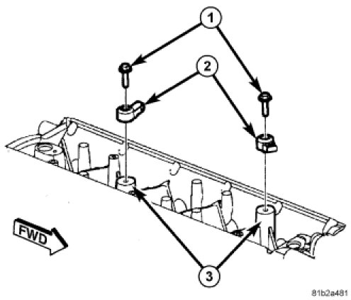 1. Install the knock sensors (2) to the engine block (3).