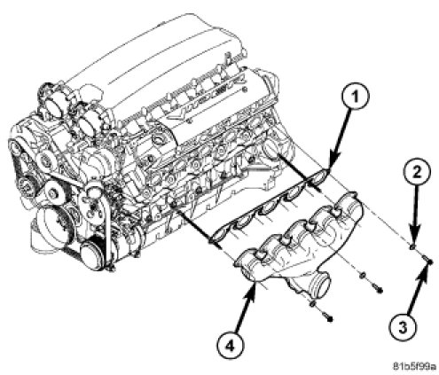 Install new gasket (1) and install exhaust manifold (4). Tighten attaching fasteners to 29 Nm (257 in. lbs.).