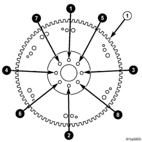 Tighten flywheel (1) bolts in sequence to 75 Nm (55 ft. lbs.).