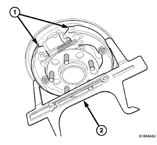 6. Place the opposite side of the brake shoe gauge (2) over the brake shoes (1) as shown.