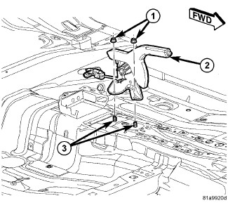 1. Place the parking brake lever (2) on the mounting studs (3) affixed to the vehicle floor pan. Install and tighten the nuts (1) to 28 Nm (250 in. lbs.).