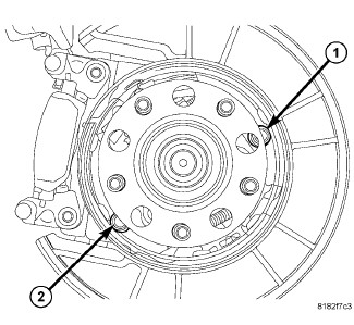 NOTE: When adjusting the parking brake shoes with the drum-in hat rotor installed, rotating the adjuster wheel (2) upward will loosen the adjustment. Rotating the adjuster wheel (2) downward will tighten the adjustment.
