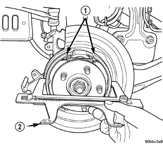 9. Place Gauge (2) over the parking brake shoes (1) at their widest point.